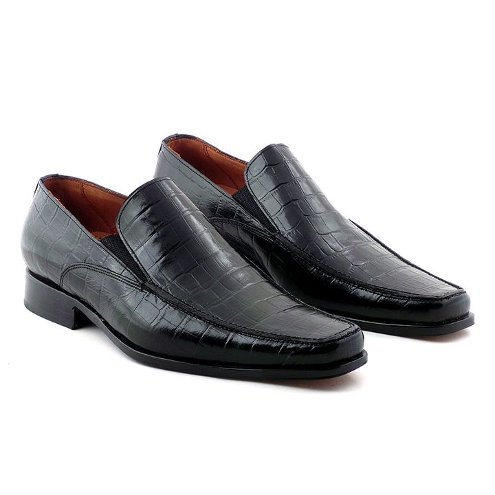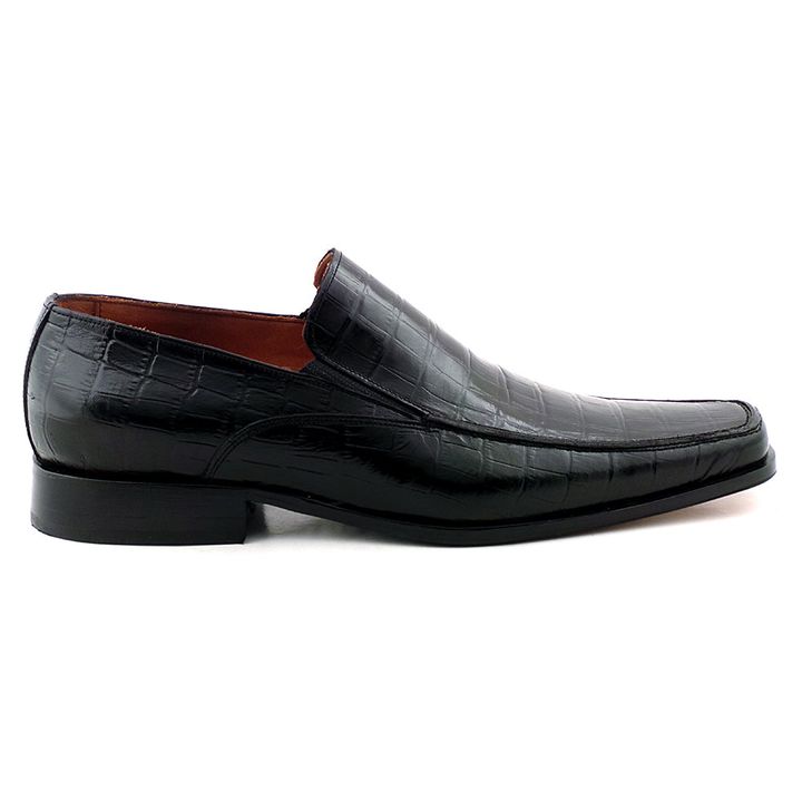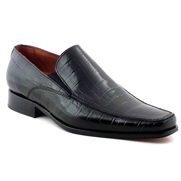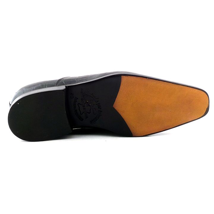 Zapato sin cordones fabricado en cuero croco negro de primera calidad. Elegante modelo que incorpora pequeños elásticos en la parte delantera y detalles de costuras laterales. Incluyen base de suela y forro de cuero para mayor suavidad. Estupendos para utilizar en el trabajo como en ocasiones formal...
